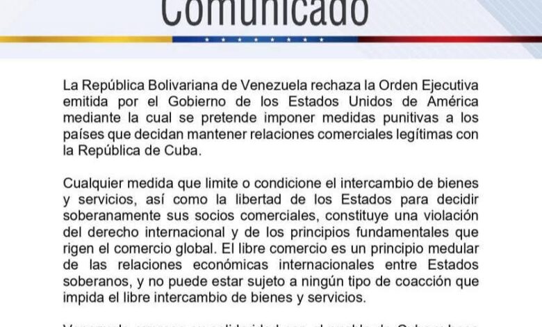 في بيان رسمي لها أعربت حكومة فنزويلا، عن رفضها للتصعيد الأمريكي ضد كوبا، المتمثل في فرض عقوبات على الدول التي تقيم علاقات تجارية مع كوبا، وجاء البيان الفنزويلي على النحو التالي، ” ترفض جمهورية فنزويلا البوليفارية الأمر التنفيذي الصادر عن حكومة الولايات المتحدة الأمريكية، والذي يسعى إلى فرض تدابير عقابية على الدول التي تقرر الحفاظ على علاقات تجارية مشروعة مع جمهورية كوبا”.