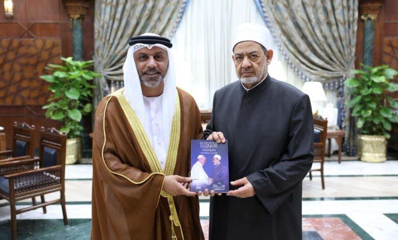 من جهته، عبَّر السفير الإماراتي عن سعادته الغامرة بلقاء فضيلة الإمام الأكبر، وتقدير بلاده لما يقوم به فضيلتُه من جهود كبيرة في نشر صحيح الدين وتعزيز ثقافة التسامح والأخوة الإنسانية، مؤكدًا سعادته بتوليه مهامَّ السفير الإماراتي في مصر، هذا البلد العزيز على قلوب الشعب الإماراتي، وأمله في أن يكون جسرًا لتعزيز العلاقات التي طالما امتازت بالترابط والتماسك، مؤكدًا أنه سيسعى لتعزيز الروابط الإماراتيَّة الأزهرية، وسيتابع عن قرب تطور المبادرات المشتركة مع الأزهر وجهود التعاون فيما يحقق الخير.