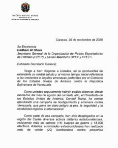 أدانت فنزويلا، من خلال رسالة بعث بها الرئيس الفنزويلي نيكولاس مادورو، إلى الأمين العام لمنظمة الأوبك، والدول الأعضاء في منظمة الأوبك، ومنظمة الأوبك بلس، محاولة الولايات المتحدة الاستيلاء على احتياطيات النفط الهائلة في بلاده- وهي الأكبر في العالم- باستخدام القوة العسكرية، مما سيؤثر بشكل خطير على توازنات سوق الطاقة العالمية. وأكد مادورو، في رسالته أن فنزويلا ستظل صامدة في الدفاع عن مواردها الطبيعية من الطاقة، ولن يوقفنا شيء وسنظل أحراراً وذوي سيادة.
