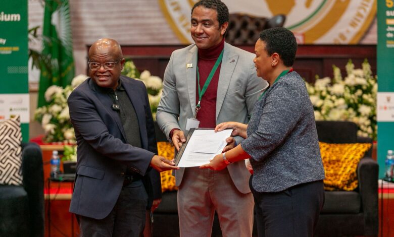 سَلَّمَ المصري حسن غزالي، عضو لجنة الاتصال بآلية مراجعة النظراء الإفريقية ومؤسس شبكة التضامن العالمي ، مخرجات مؤتمر الشباب الإفريقي الخامس بجنوب أفريقيا إلى السيد دادا موريرو، عمدة مدينة جوهانسبرج، ورئيسة آلية مراجعة النظراء الإفريقية السفيرة ماري أنطوانيت، وذلك في ختام فعاليات مؤتمر الشباب الإفريقي، الذي عُقد بالبرلمان الإفريقي في جنوب أفريقيا تحت شعار: “الشباب في الحكم: من الوعد إلى الازدهار”.