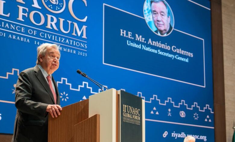 وتحدث غوتيريش عن طريقين: أحدهما يغذي الخوف ويُقيم الجدران ويزيد الحروب، والآخر أصعب لكنه أساسي، وهو طريق بناء الجسور بين الأديان والثقافات والحضارات.