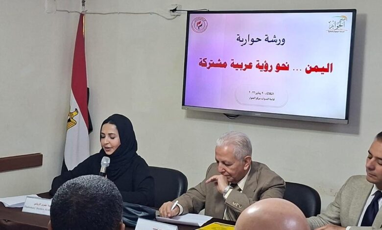 عقد البرنامج اليمنى التابع لمركز الحوار للدراسات السياسية والإعلامية برئاسة الدبلوماسية اليمنية بشرى الإرياني، الورشة الحوارية الموسومة بـ«الدور العربي الجامع في صون وحدة اليمن واستعادة الاستقرار»، افتتحها السيد اللواء أركان حرب حمدي لبيب رئيس مؤسسة الحوار، وبمشاركة محمد عمر الصحفي والخبير في الشؤون اليمنية، فيما أدار فعاليات الورشة الإعلامي هاني الجمل، وبمشاركة نخبة من القيادات السياسية والدبلوماسية والبرلمانية والصحفية.