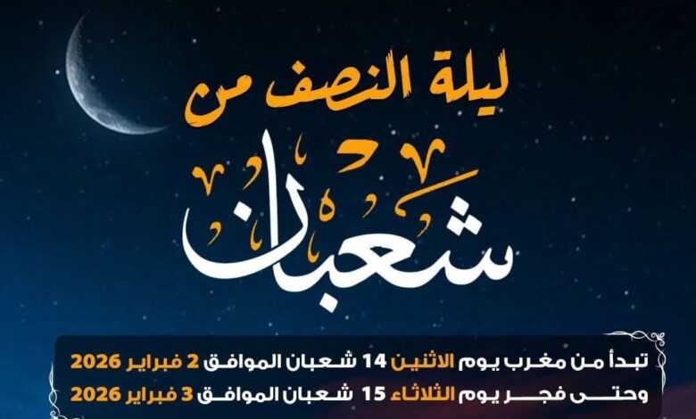 هذا وتبدأ ليلة النصف من شعبان هذا العام 1447هـ، من مغرب يوم الاثنين 14 شعبان الموافق 2 فبراير 2026، وحتى فجر يوم الثلاثاء 15 شعبان الموافق 3 فبراير 2026، وهي من الليالي المباركة التي تُرفع فيها الأعمال إلى الله.