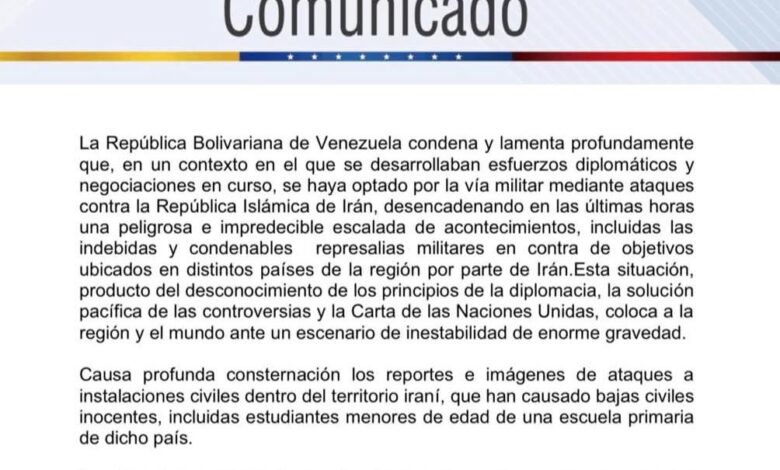 في بيان رسمي لها قالت جمهورية فنزويلا البوليفارية، أنها تدين وتأسف بشدة لأنه في سياق الجهود الدبلوماسية والمفاوضات الجارية، تم اللجوء إلى الخيار العسكري من خلال شن هجمات على جمهورية إيران الإسلامية، مما أدى في الساعات الأخيرة إلى تصعيد خطير وغير متوقع للأحداث، بما في ذلك الانتقام العسكري غير المبرر والمستهجن من قبل إيران ضد أهداف تقع في مختلف بلدان المنطقة، وهذه الحالة، التي هي نتاج تجاهل مبادئ الدبلوماسية، والحل السلمي للنزاعات، وميثاق الأمم المتحدة، تضع المنطقة والعالم في موقف من عدم الاستقرار بالغ الخطورة.