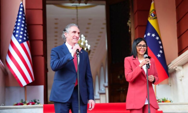 استقبلت ديلسي رودريغيز، الرئيسة – المؤقتة- الفنزويلية، وزير الداخلية الأمريكي ورئيس مجلس الطاقة دوغ بورغوم، في ميرافلوريس، ويهدف هذا اللقاء إلى تعزيز التبادل الثنائي في مجال الطاقة والتعدين.